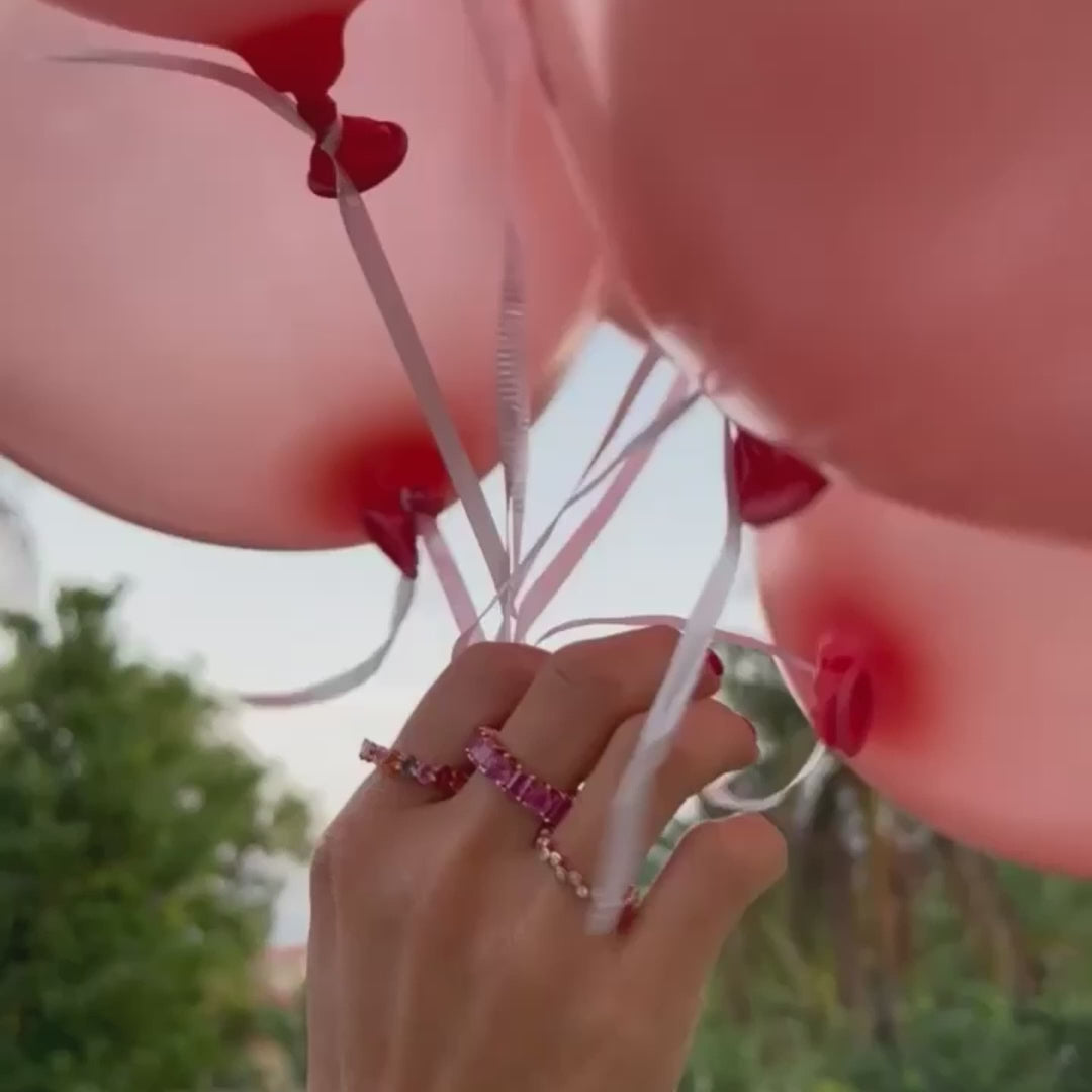 This emerald-cut pink sapphire eternity half ring is classy, elegant, and timeless. These sapphires go halfway around a 14k rose gold band.