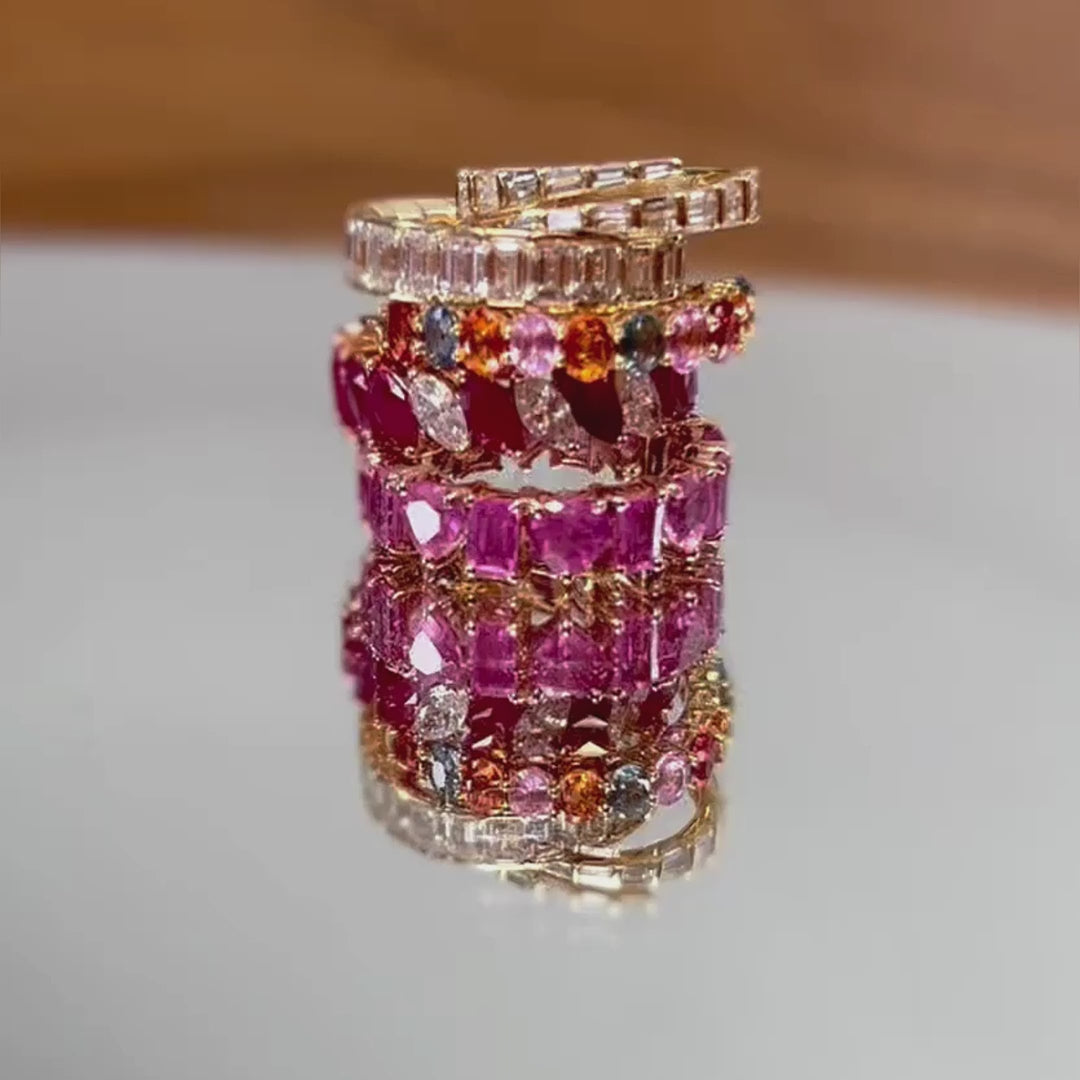 When you're in the mood for classic yet modern jewelry, this ruby and diamond band is what you're looking for. Marquise cut diamonds and ruby are set around a yellow gold band, creating a piece that can be layered over or used independently.